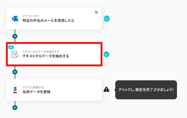 - 次に、オペレーションでAI機能の「テキストからデータを抽出する」を設定し、受信したメール本文から会社名や氏名などの情報を抽出します。