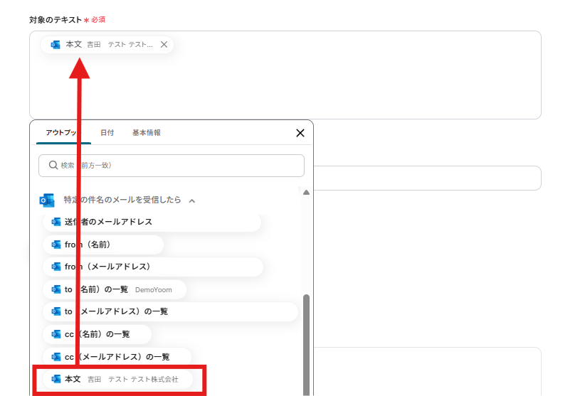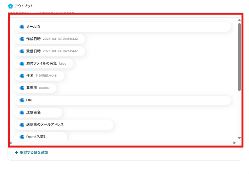 ※アウトプットとは、トリガーやオペレーション設定時に、「テスト」を実行して取得した値のことを指します。