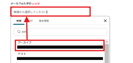 メールフォルダID:Outlook内のIDを候補から選択します。候補は枠内をクリックすると表示されます。
