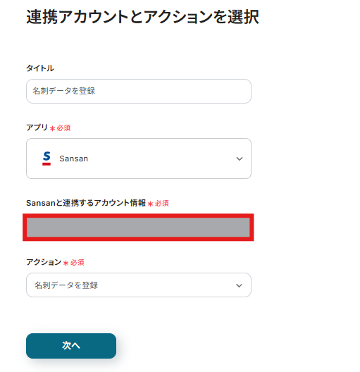 - 次に、オペレーションでSansanを選択し、「名刺データを登録」アクションを設定します。