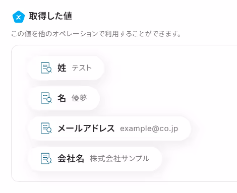 「First Name」「Last Name」「Company Name」は、入力欄をクリックして表示される取得した値から選択してください。