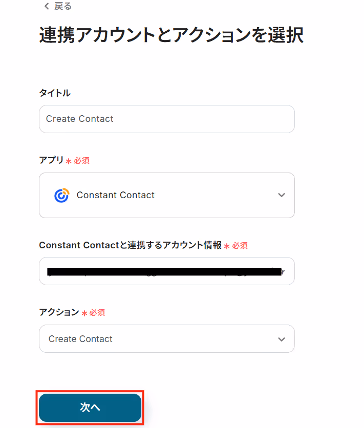 連携するアカウント情報には、ステップ1で連携したアカウント情報が反映されています。トリガーアクションはそのままにして、「次へ」をクリックしてください。