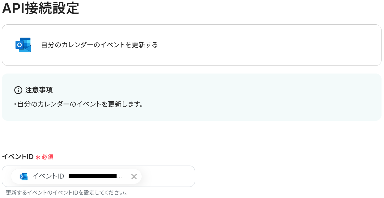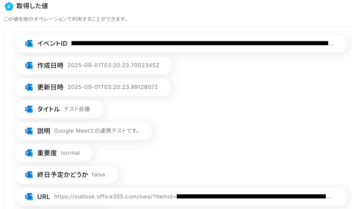 この後の設定で、先ほど作成したOutlookのイベントと以下の取得した値=作成した会議URLを合わせ、Outlookのイベントを更新します。