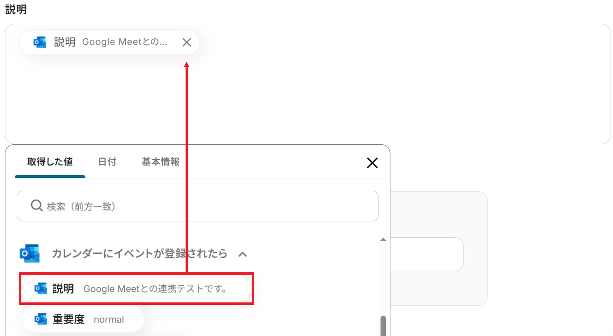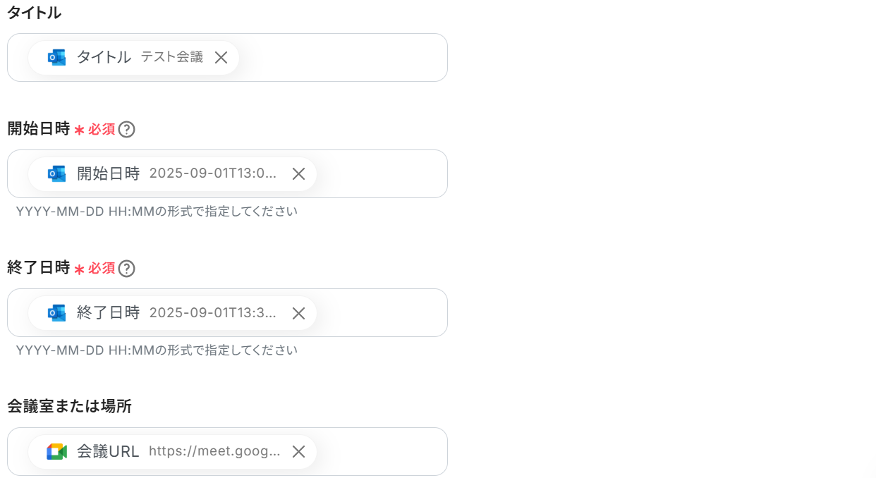 ※以下のようにOutlookやGoogle Meetの取得した値を設定することで、トリガーが実行されるたびに最新の情報を反映できます。
