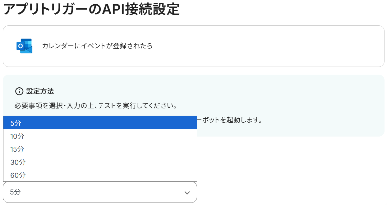 アプリトリガーのAPI接続設定という画面が表示されるので、まずトリガーの起動間隔をプルダウンから選択してください。