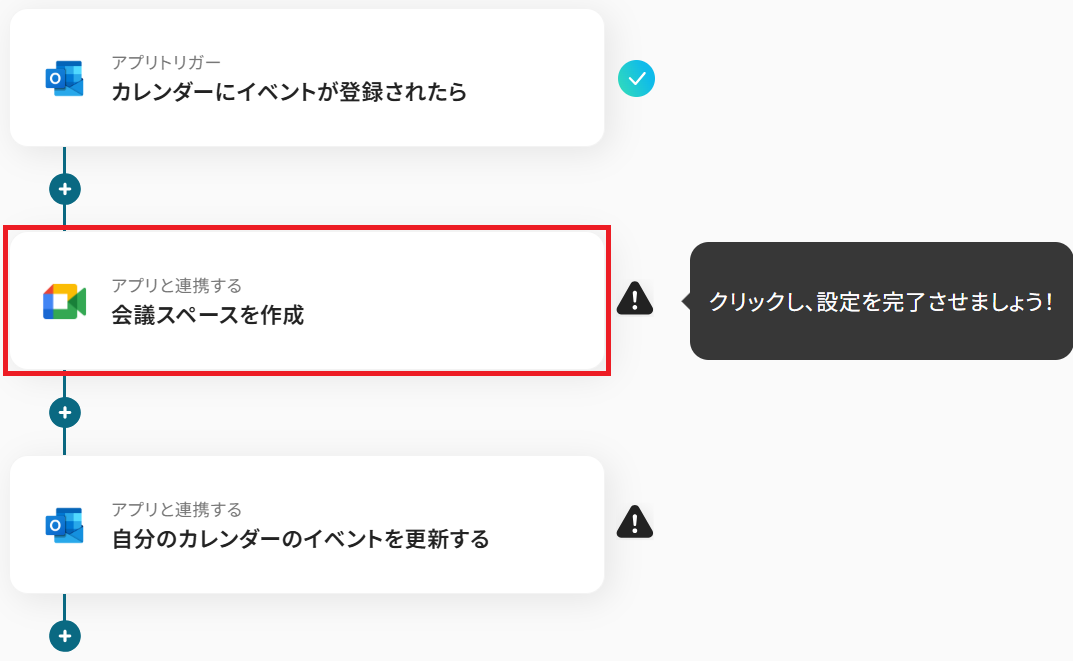 このワークフローを活用すれば、Outlookで特定の予定が作成されるだけで、Google Meetの会議スペースが自動で作成され、予定に追加されます。
