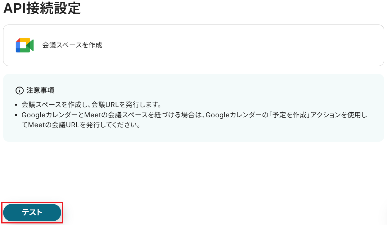 API接続設定に移るので、そのままテストしましょう。