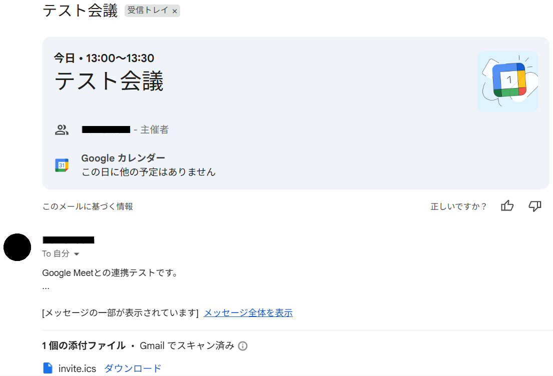 また、参加者として入力したメールアドレス宛に招待メールも届きました。