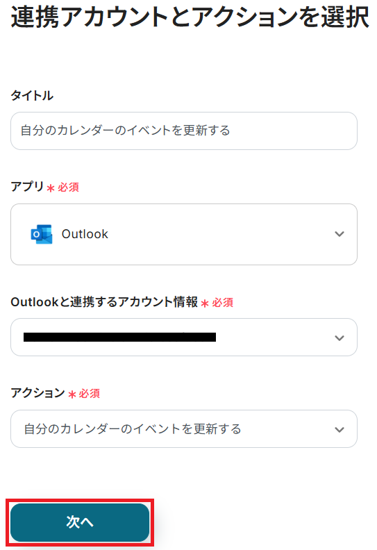 ステップ3・4と同様、アクションは「自分のカレンダーのイベントを更新する」のまま「次へ」をクリック。
