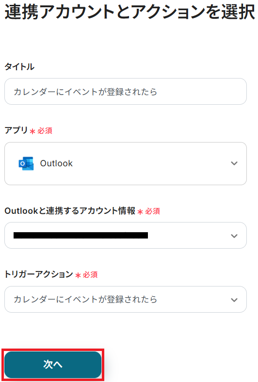 タイトルと連携するアカウント情報を任意で設定し、トリガーアクションはテンプレート通りに「カレンダーにイベントが登録されたら」のまま「次へ」をクリック。