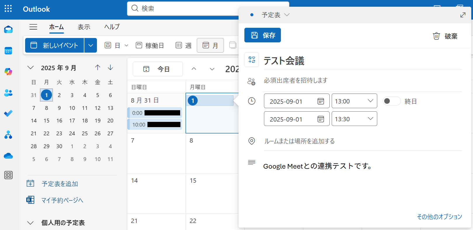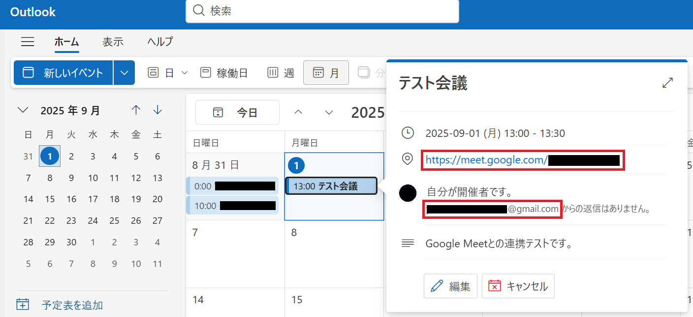 Google Meetの会議URLや参加者のメールアドレスが、Outlookのカレンダーに自動で追加されました!
