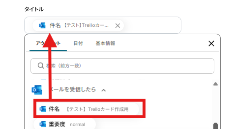 「タイトル」の箇所では、以下の画面のようにOutlookから取得したアウトプットを利用し「件名」を入力しています。
