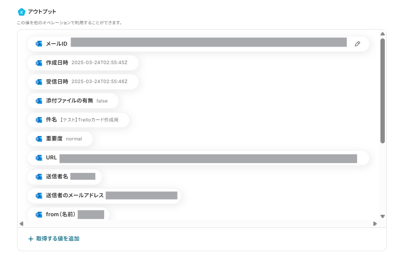 以下のアウトプット画面のように、実際にOutlookから取得した情報が確認でき、この後の設定でこのアウトプットの情報を値として使用することができるようになります。