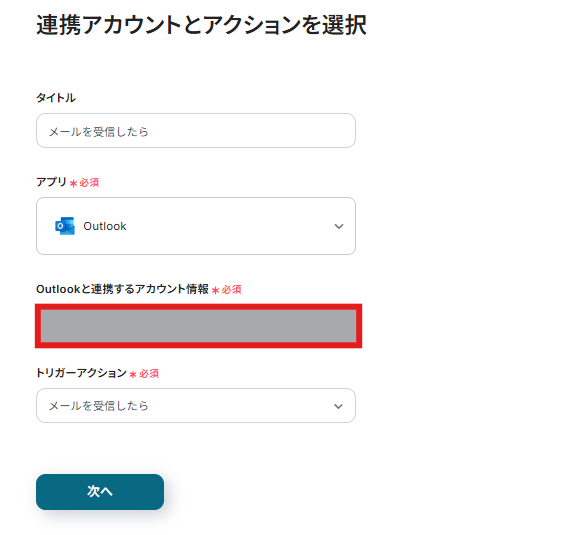 連携アカウントとアクションを選択する画面が表示されるので、今回連携するOutlookのアカウントで間違いがないかを確認し「次へ」をクリックします。