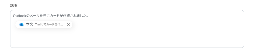 - Trelloのカードタイトルには、Outlookの件名や送信者名を変数として設定できます。また、メール本文をそのままカードの詳細に埋め込むこともできます。