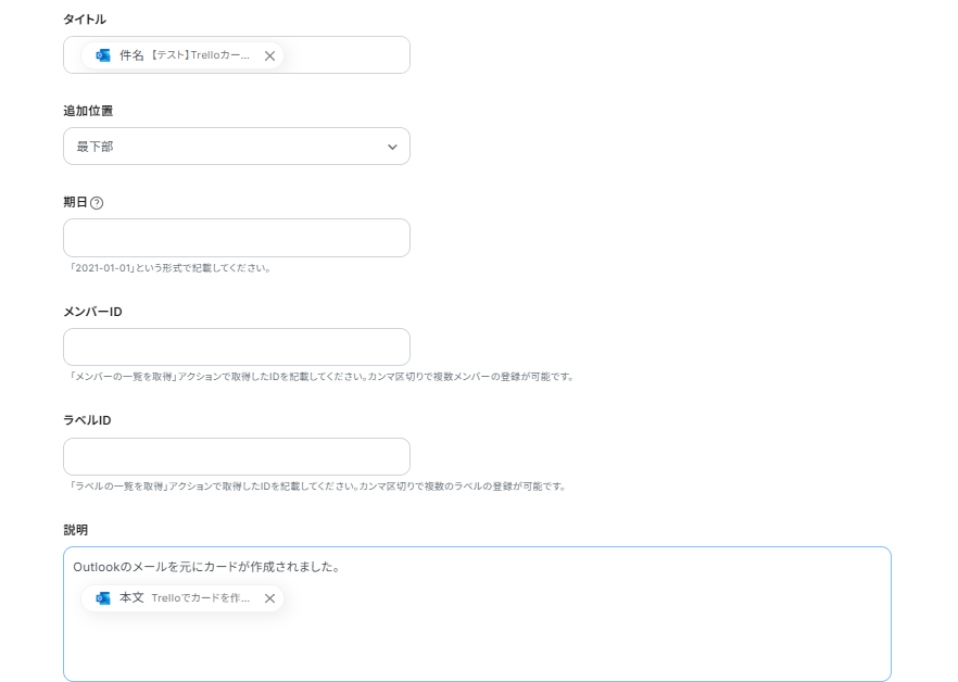 - Trelloでカードを作成するアクションでは、作成先のボードやリストを指定できます。また、カードのタイトルや説明に、Outlookの予定に関する動的な情報を埋め込んだり、定型文などの固定値を設定したりすることが可能です。