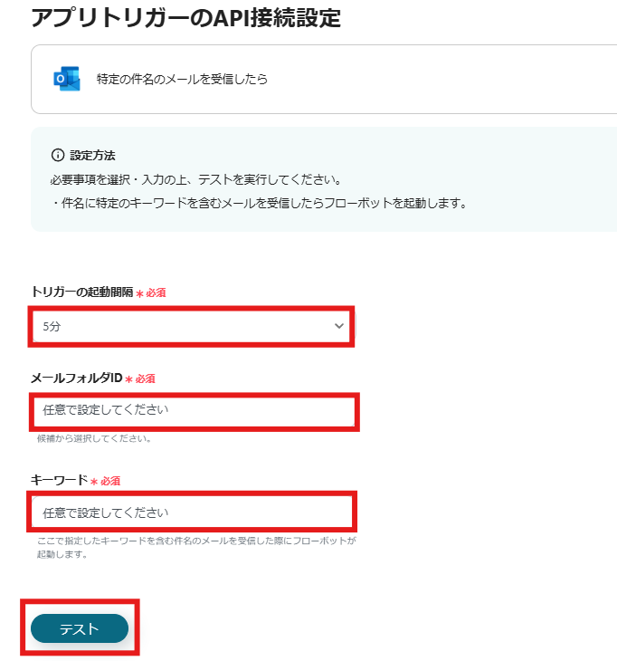 ・メールフォルダID:連携したOutlookのアカウントのメールフォルダ内から選択できます。