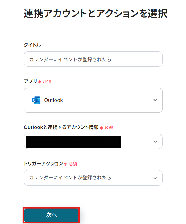 1) アクションは「カレンダーにイベントが登録されたら」を選択して、「次へ」をクリックします。