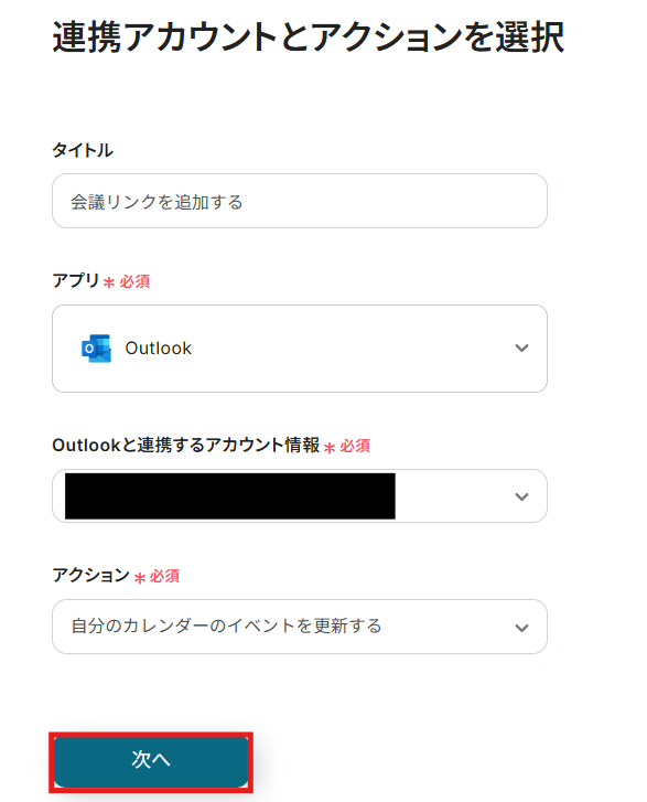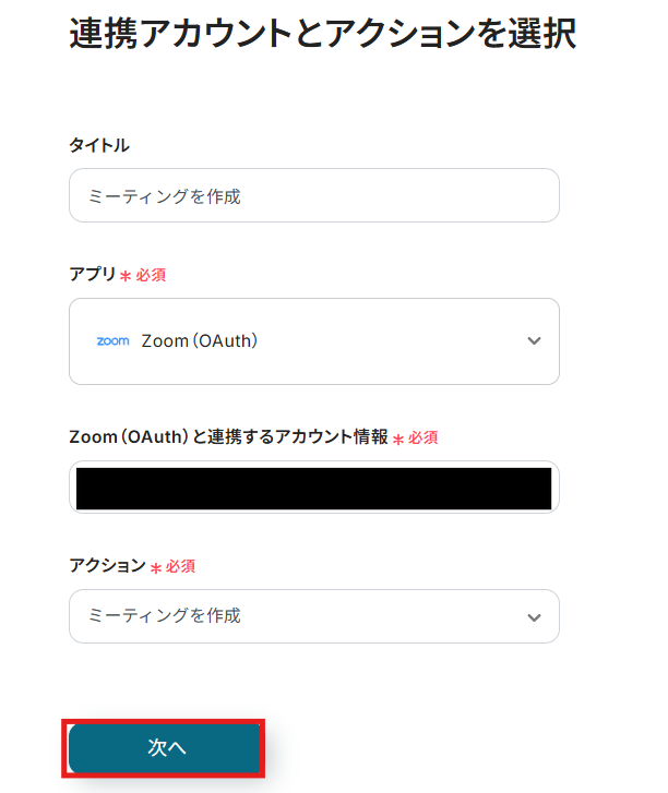 2) アクションは「ミーティングを作成」を選択して、「次へ」をクリックします。