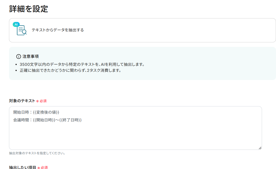 2) 変換タイプは「3,500文字以内のデータからテキストを抽出(2タスク)」を選択して、「次へ」をクリックします。