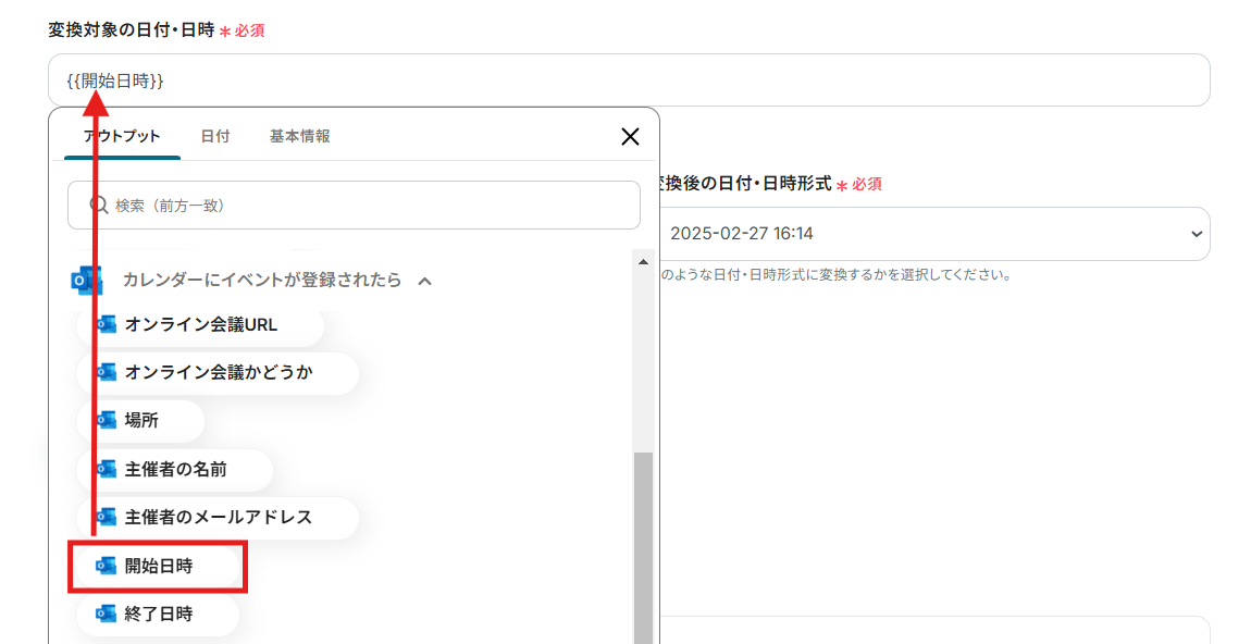 2) アクションは「日付・日時形式の変換」を選択して、必須項目を入力します。