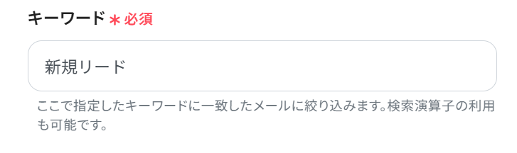 キーワード:指定したいキーワードを入力します。今回はテストのため「新規リード」と設定しています。また、Gmailの検索演算子の利用も可能です。
