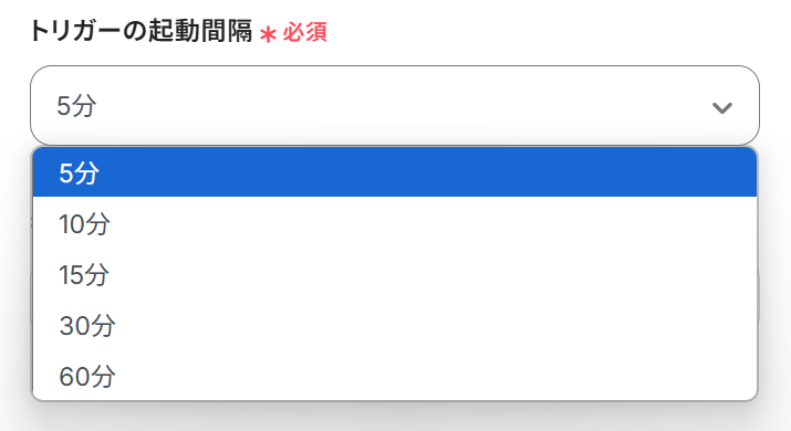 - トリガーの起動間隔:5分、10分、15分、30分、60分の間隔で起動間隔を選択できます。