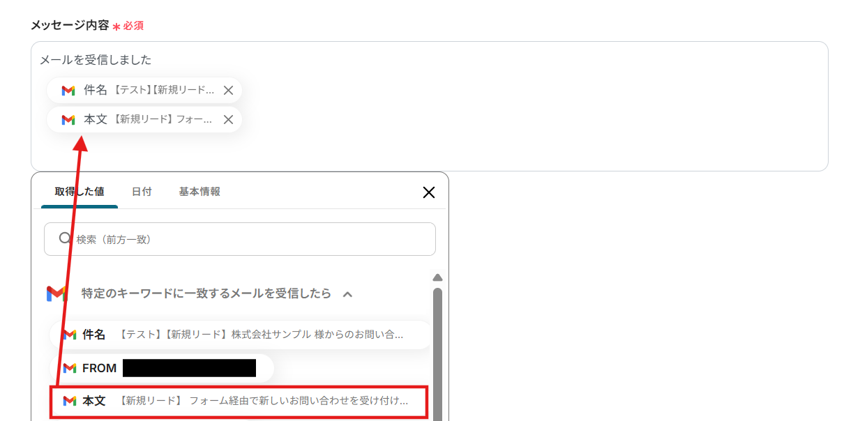 「メールを受信しました」など、変えない部分は手入力で問題ありませんが、それ以外の箇所は編集欄をクリックして「取得した値」を引用するようにしましょう。