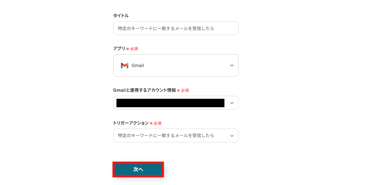 Gmailと連携するアカウント情報はマイアプリ連携したものが選択されています。必要であればタイトルをわかりやすいものに修正し、トリガーアクションは変更せずに進めてください。