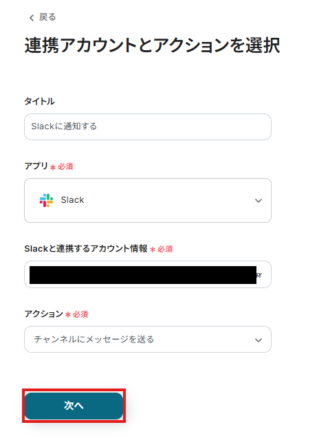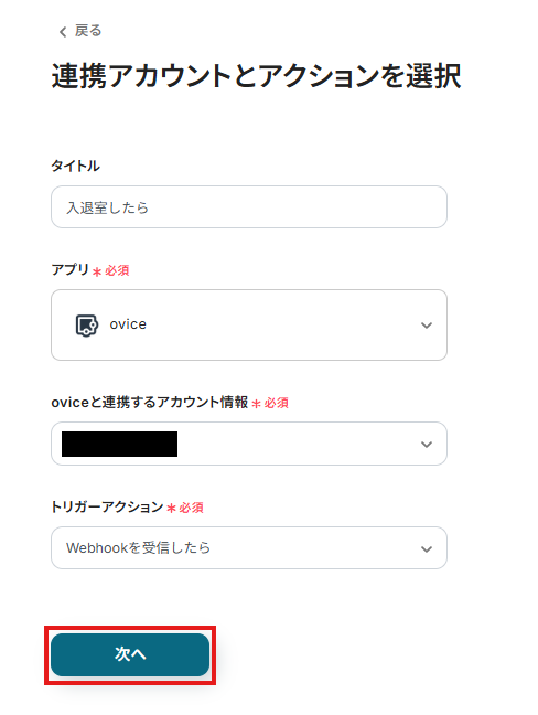 2.表示された画面で必須項目を入力します。トリガーアクションはそのままにして、「次へ」をクリックしましょう。