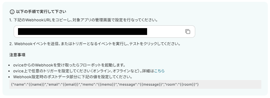 ※以下の画面は、Yoomページ画面左側「マイプロジェクト」のフローボットで表示される、「【コピー】oviceで入退室が行われたらSlackに通知する」をクリックすると表示されます。