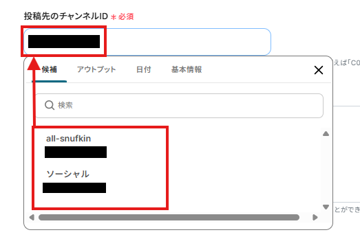 「投稿先のチャンネルID」は、入力欄をクリックして表示される候補から選択してください。