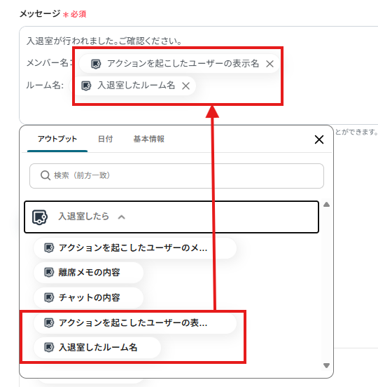 「メッセージ」は、入力欄をクリックして表示されるアウトプットから選択できます。