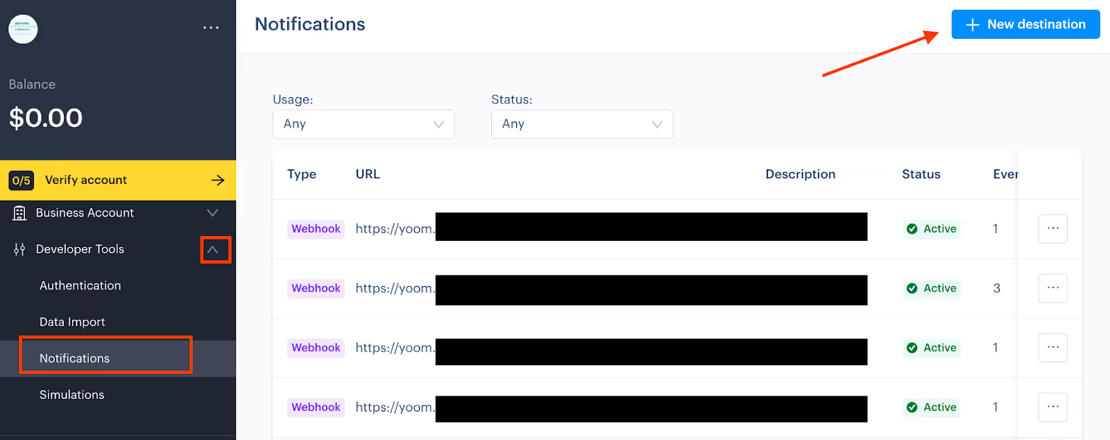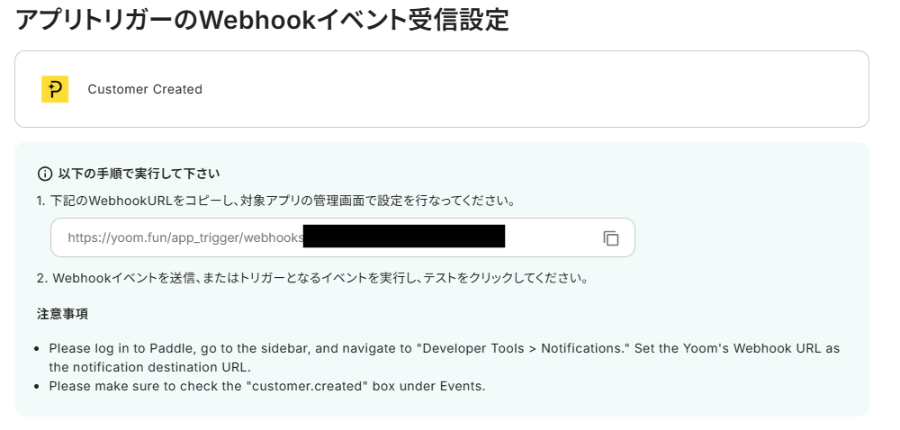 4.Paddleにログインし、通知先URLとしてYoomの画面で表示されているWebhook URLを設定してください。