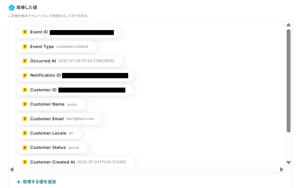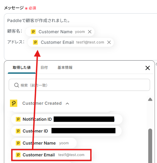 6.実際にPaddleでテスト用のCustomerを作成し、Yoomで「テスト」をクリックしてください。