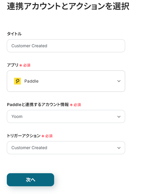 タイトルと連携するアカウント情報を任意で設定し、トリガーアクションはテンプレート通りに「Customer Created」のまま「次へ」をクリックして進んでください。