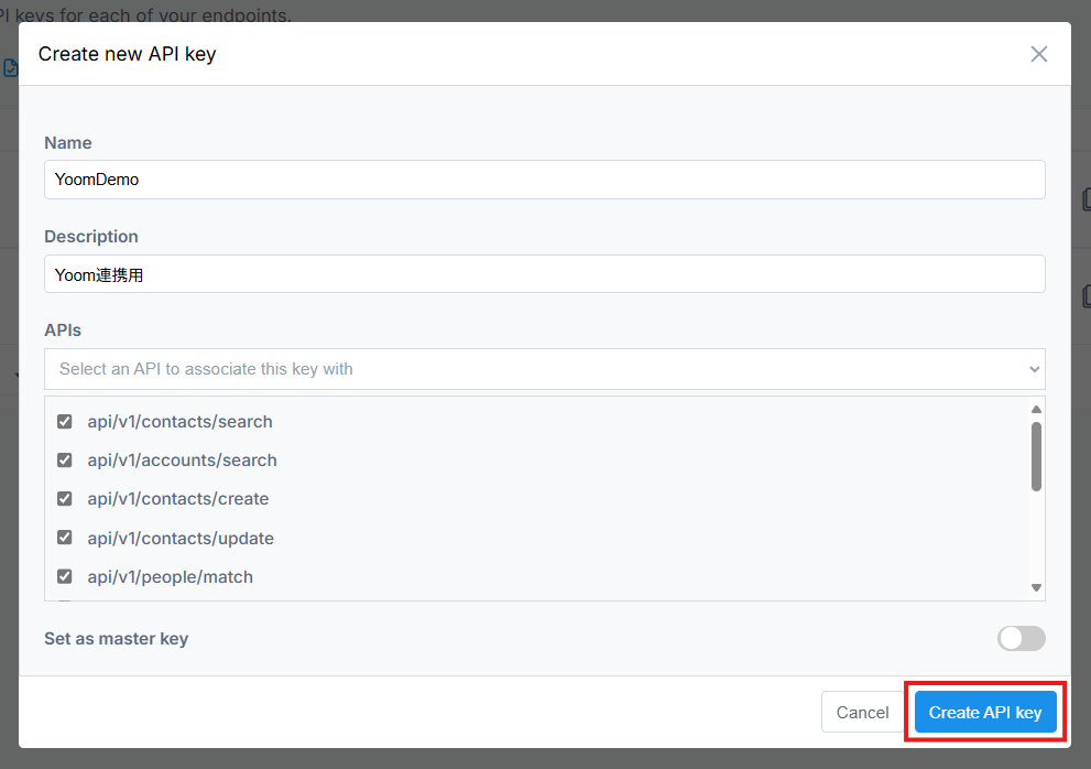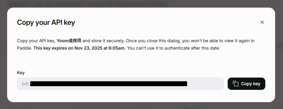 ※ ダイアログを閉じるとAPIキーが確認できなくなります。