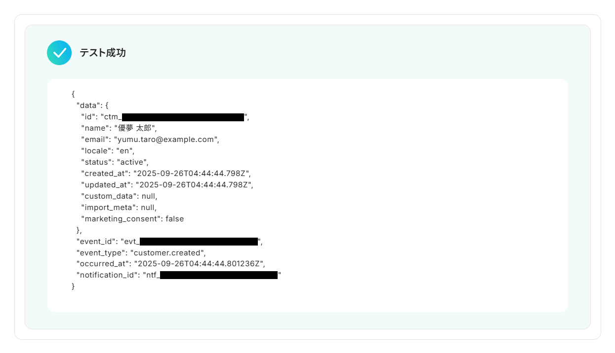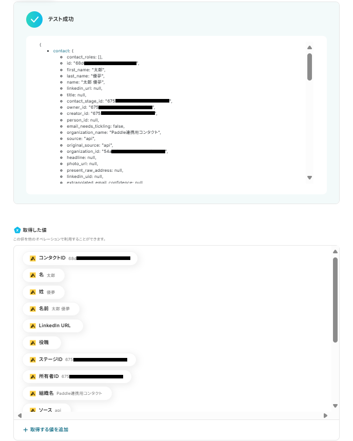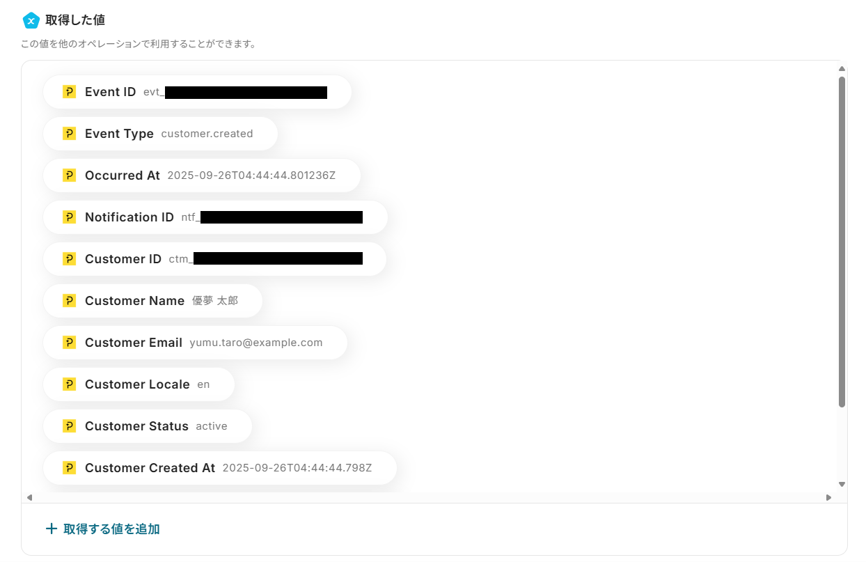 または、Paddleの「Get a Customer」オペレーションを追加し、カスタムデータを取得しましょう。