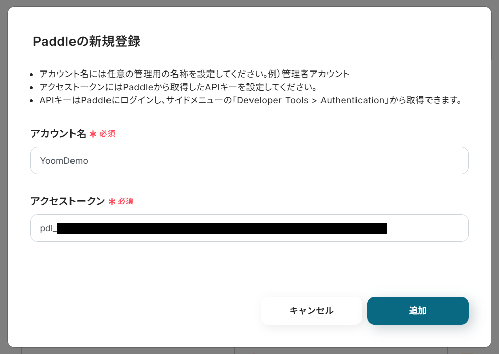 - コピーしたAPI KeyをYoom側の「アクセストークン」に設定して、「追加する」をクリック。