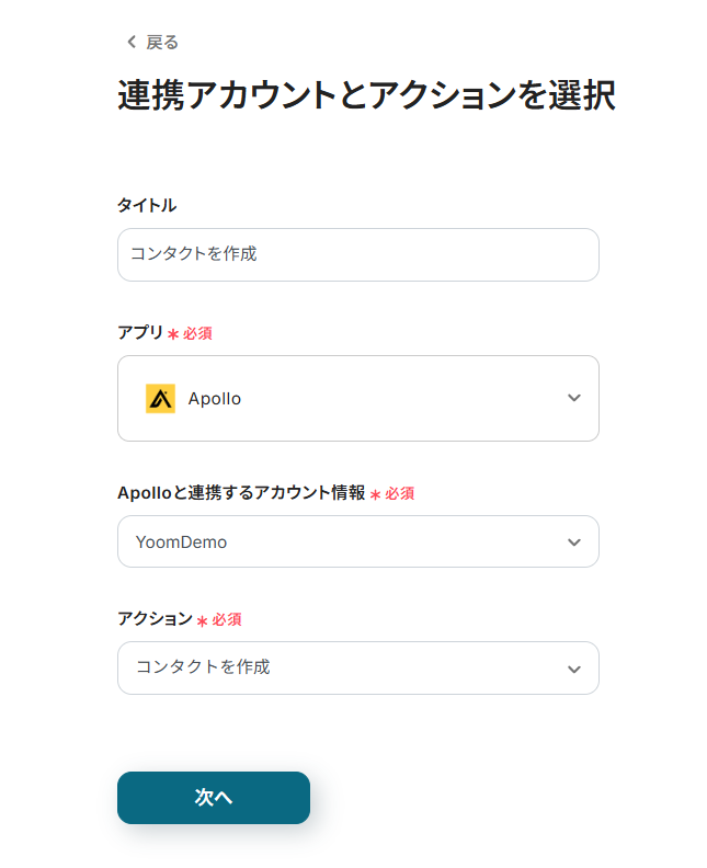 - 最後に、オペレーションでApolloを選択し、「コンタクトを作成する」アクションで、抽出したデータを用いてApolloに新しいコンタクトを登録します。