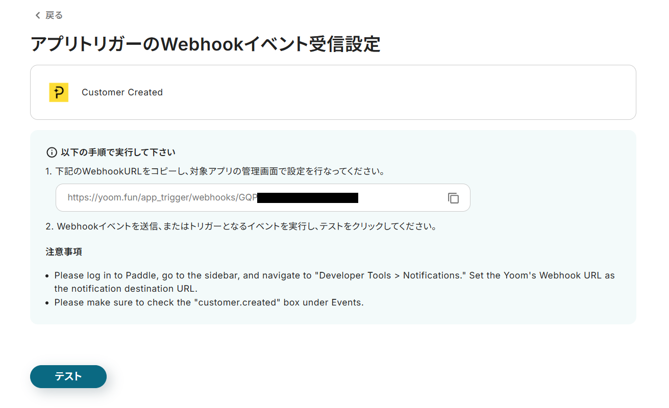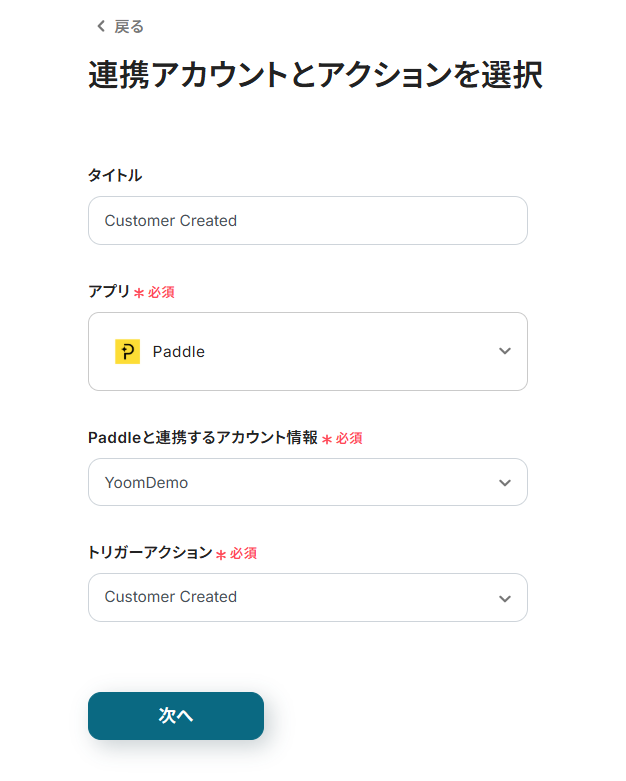 - 次に、トリガーでPaddleを選択し、「Customerが作成されたら」というアクションを設定します。