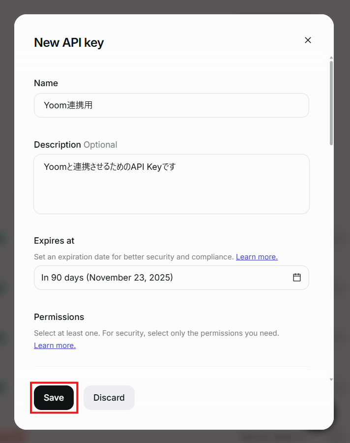- API Keyの名称と用途の説明、Yoomへのアクセス権限(Permissions)を設定して「Save」をクリック。
