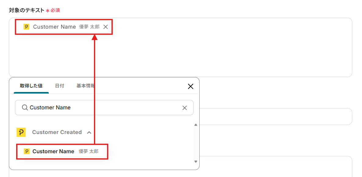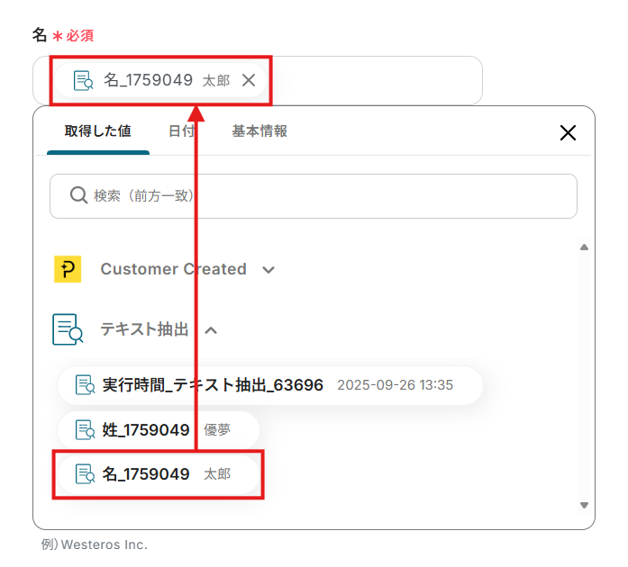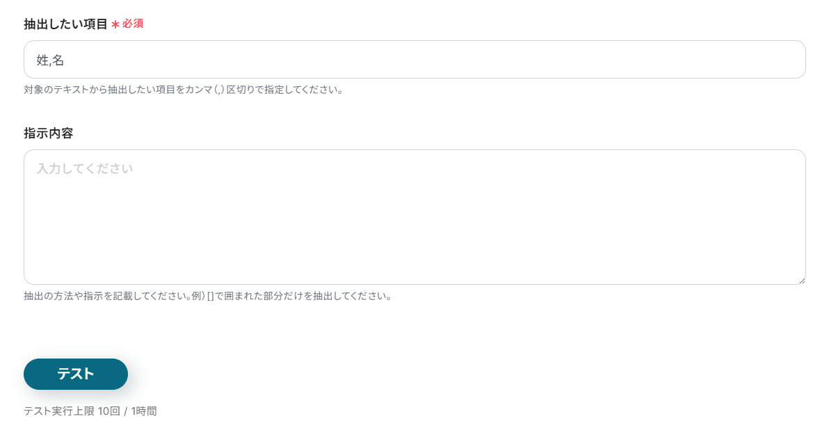 この場合は、「対象のテキスト」に取得した値のCustomer Emailを、「抽出したい項目」に会社名を追加した上で、「指示内容」にドメインから会社名を抽出する指示を設定してください。