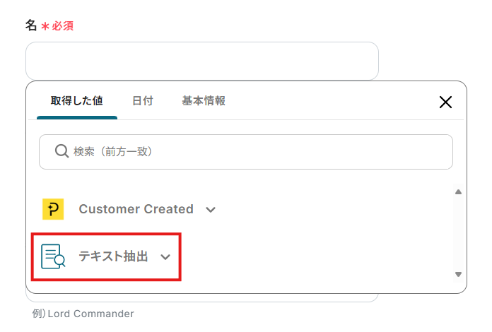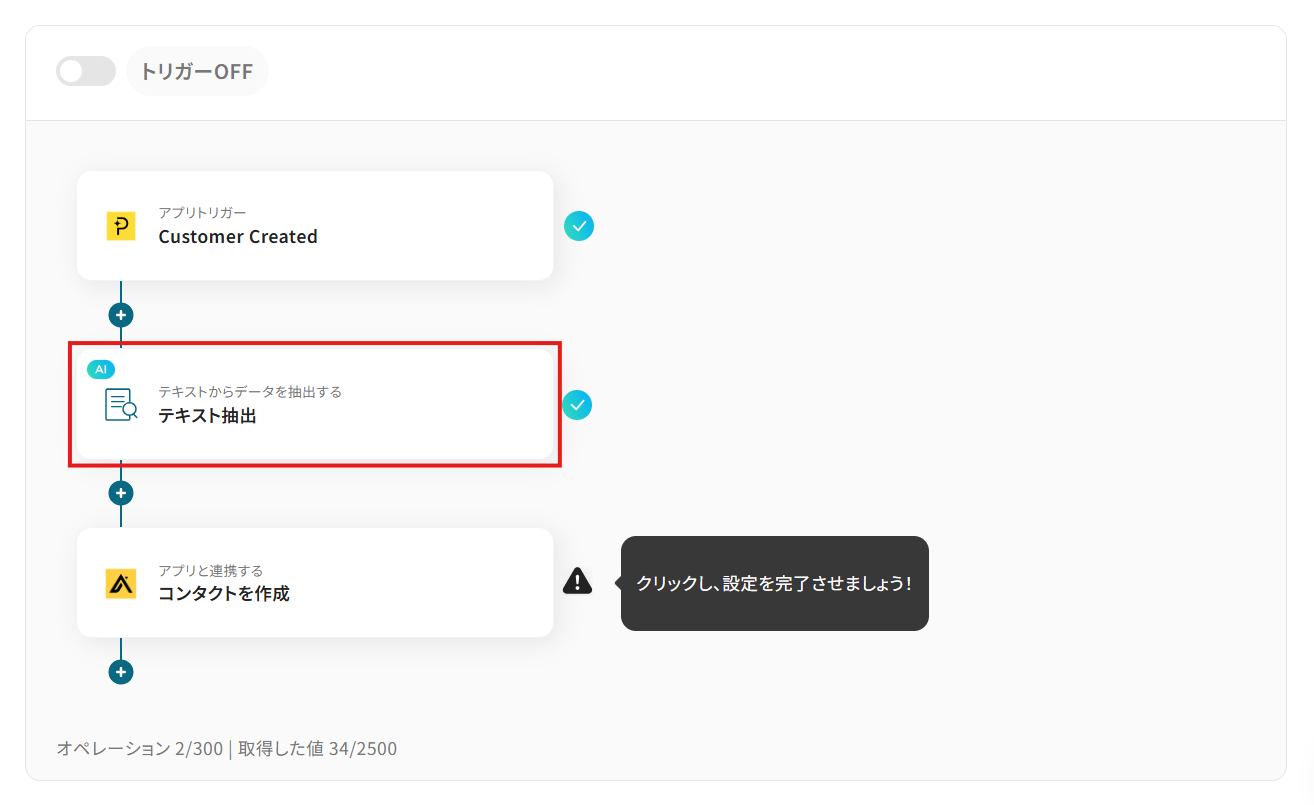 - 次に、オペレーションでAI機能を選択し、「テキストからデータを抽出する」アクションでPaddleから取得した顧客の氏名を整形します。