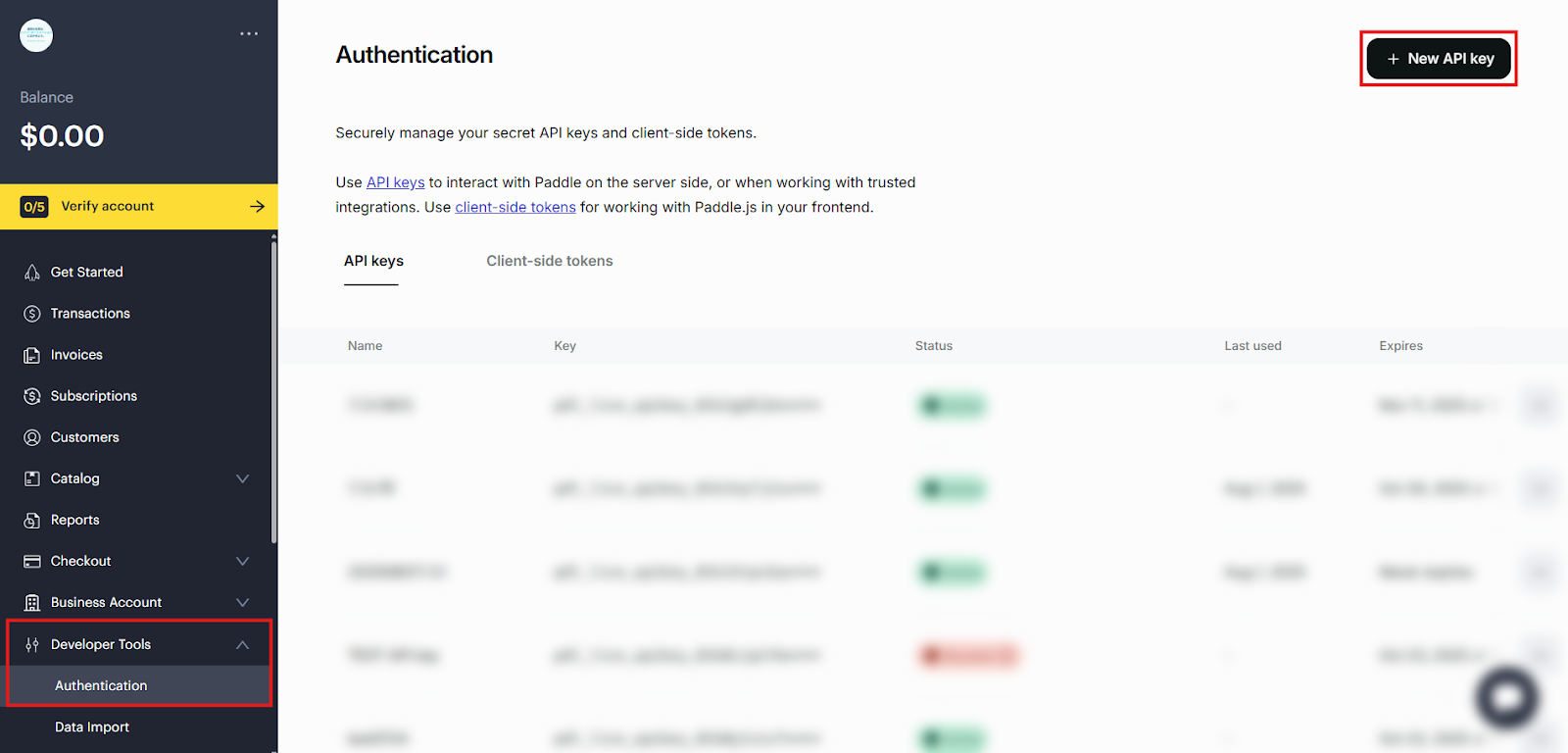 - Paddleにログインし、サイドメニューの「Developer Tools」から「Authentication」にアクセス。