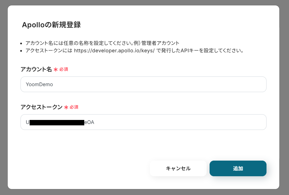 - 「アクセストークン」にはApolloから取得できるAPI keyを設定します。