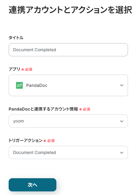 タイトルと連携するアカウント情報を任意で設定し、トリガーアクションはテンプレート通りに「Document Completed」のまま「次へ」をクリックして進んでください。