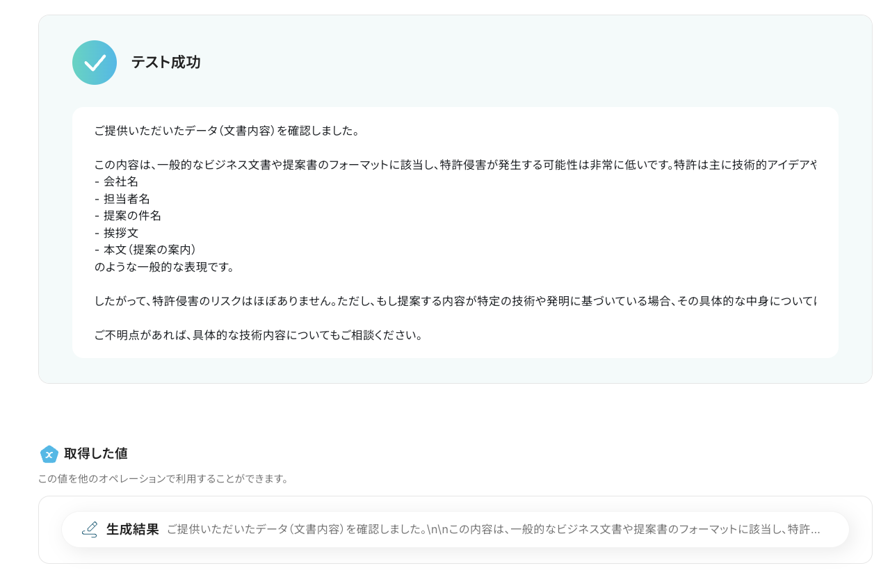 設定が完了したら「テスト」をクリックし、ステップ4で抽出したテキストデータを基に、特許侵害のチェックが正常に行われたことを確認しましょう。 ※回答がイマイチだな…と感じた場合は、プロンプトを編集して再度試してみてくださいね!