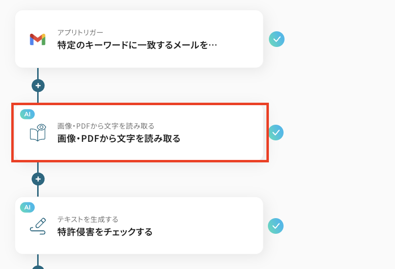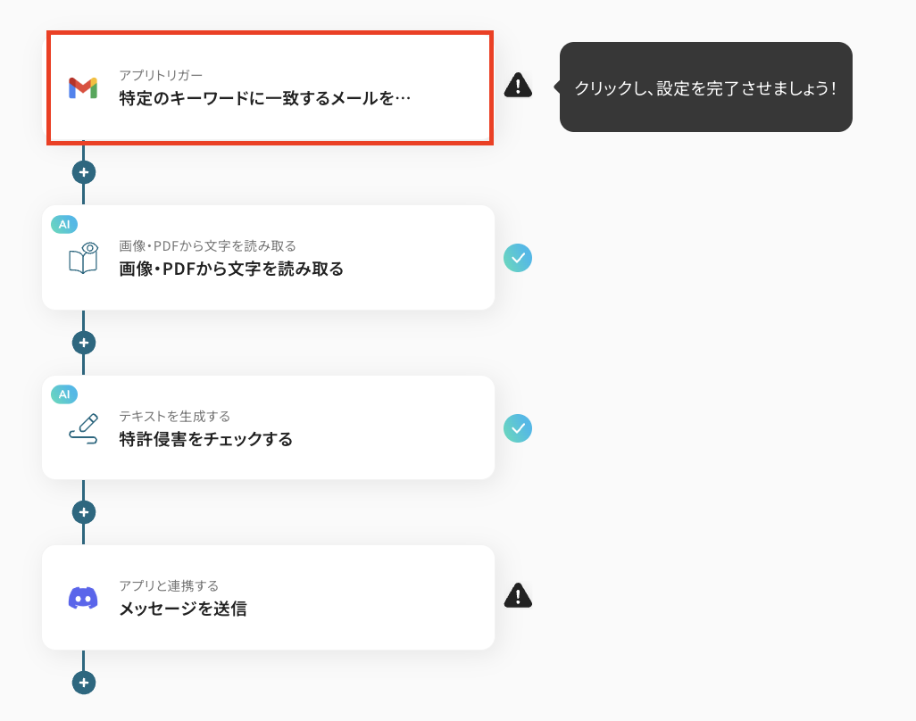 Gmailで特許関連の書類を受信した際に、OCRでテキスト情報を抽出し、AIが特許侵害の可能性を分析、その結果をDiscordなどのチャットツールへ自動で通知する ことができます。