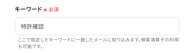 「キーワード」に、フローを起動するきっかけとなるキーワードを設定します。 「特許確認」など、活用シーンに合わせて自由に設定してくださいね! ここで設定したキーワードに一致するメールを受信した際に、フローボットが起動するようになります。